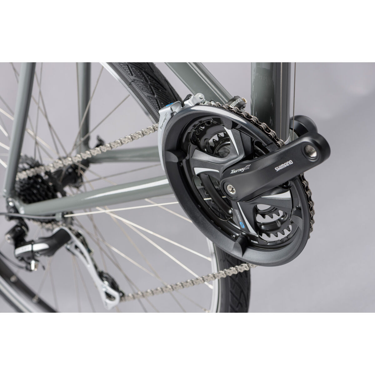 | Style | Equipped with a Shimano drive train including a Shimano Acera 48/38/28 chain set up front and an 8-speed cassette at the rear the Velocity offers the perfect all-round gearing you require for taking on the urban jungle. Built around a confidence inspiring 6061 heat treated aluminium frame offering a comfortable riding position and is finished with Schwalbe K-Guard tyres to keep you planted to the road in all weathers as well as powerful Shimano V-Brakes to ensure you can stop in plenty of time. |